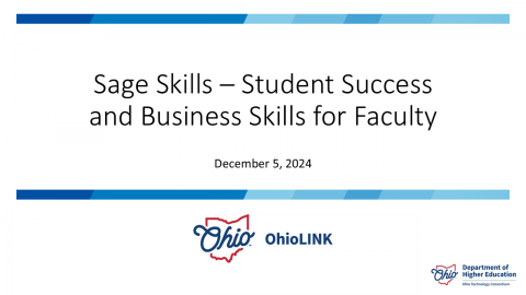 Sage Skills (Student Success and Business Skills) for Faculty Dec 5, 2024An introduction to new OhioLINK resources Sage Skills Student Success and Business Skills for a faculty audience. Includes guidance on embedding components into courses.