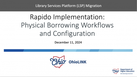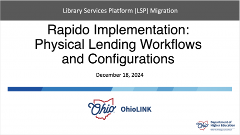 Rapido Implementation: Physical Borrowing Workflows and Configuration Dec 11, 2024Recording of Rapido Project Leads meeting with OhioLINK and Ex Libris.