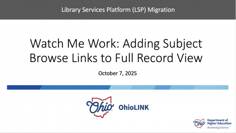 The Discovery and User Experience Working Group presented a Watch Me Work session covering configuration of the Browse Search function and Oberlin's process for adding browse links to full record v
