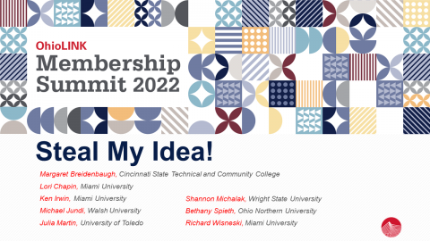 Members will share brief explanations of an idea that others could "steal" to use in their own libraries. We'll hear about a different way to structure instructional sessions, a new check-out system for keys and another for software licenses, how Excel ASAP can save you time, training for Makerspace student employees, "on call" staffing, and maintaining ILL patron records in Excel.