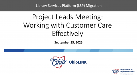 Date: Sep 25, 2025Playlists: All Webinars and Recordings 2025LSP Project Lead MeetingsSummary: Weekly meeting for project leads, Ex Libris, and OhioLINK office